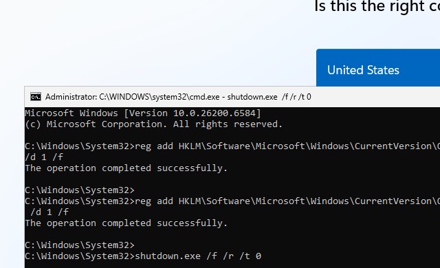 reg add HKLM\SOFTWARE\Microsoft\Windows\CurrentVersion\OOBE /v HideOnlineAccountScreens /t REG_DWORD /d 1 /f && reg add HKLM\SOFTWARE\Microsoft\Windows\CurrentVersion\OOBE /v HideWirelessSetupInOOBE /t REG_DWORD /d 1 /f && shutdown /r /t 0