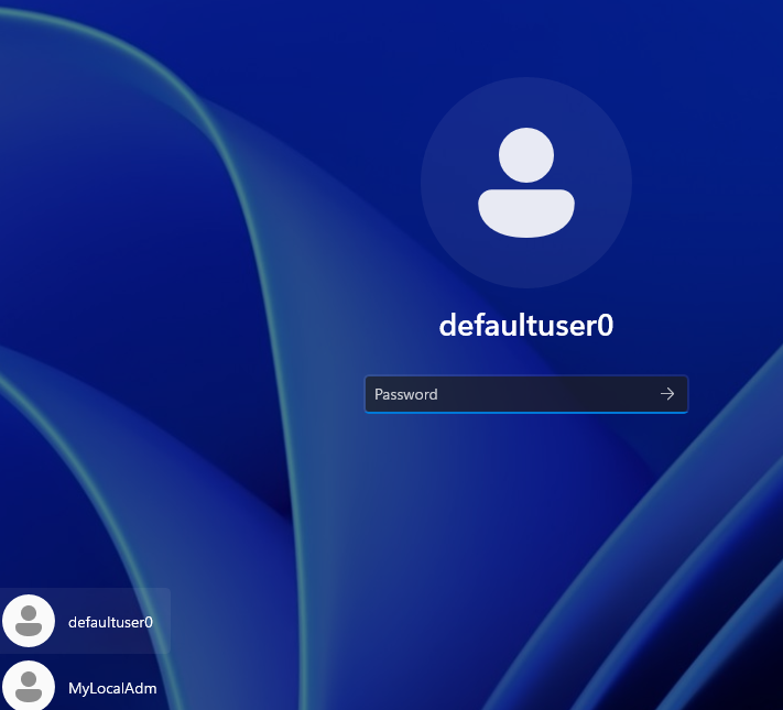 Появится стандартное окно входа в Windows 11 со списком пользователей. Будет отображаться имя пользователя, которого вы создали и defaultuser0. Выберите своего пользователя и введите его пароль.