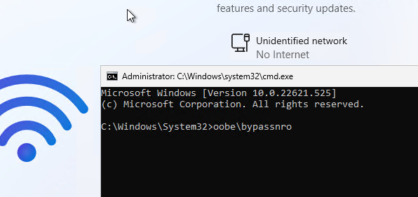 reg add HKLM\SOFTWARE\Microsoft\Windows\CurrentVersion\OOBE /v BypassNRO /t REG_DWORD /d 1 /f