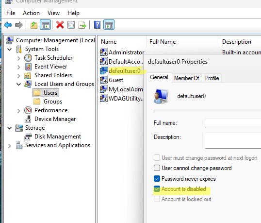 После входа в Windows отключите пользователя defaultuser0, чтобы он не отображался на экране входа.