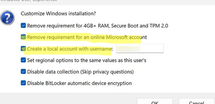 Если вы создаете установочную USB флешку с Windows 11 с помощью утилиты Rufus, при записи установочного образа можно включить опции: