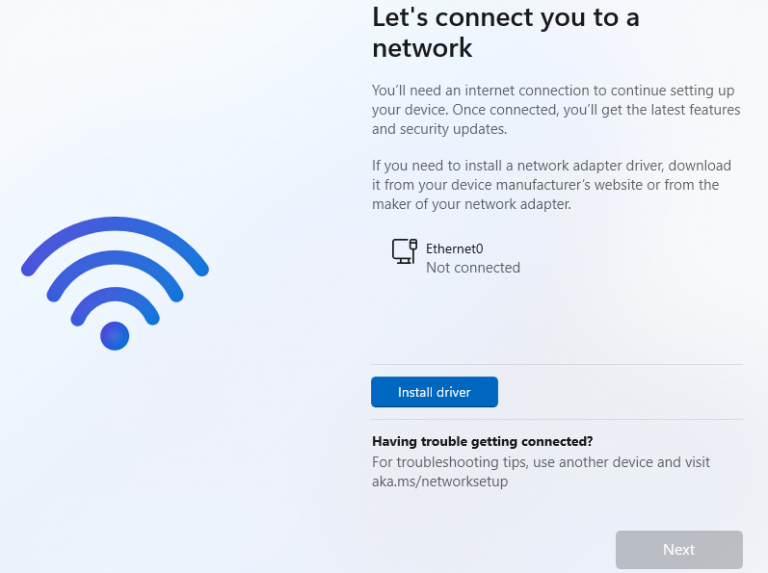 - Если ваш компьютер не подключен к интернету, то мастер первоначальной настройки Windows (Out Of Box Experience, OOBE) не позволит завершить установку Windows 11 25H2 без подключения к сети. В окне доступна только кнопка загрузки драйверов сетевого адаптера. Опция пропустить проверку наличия сети и продолжить установку с локальным аккаунтом отсутствует.