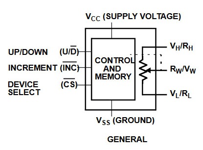 Вход U/D – UP/DOWN, в зависимости от состояния этого входа, ползунок резистора перемещается вверх или вниз.
