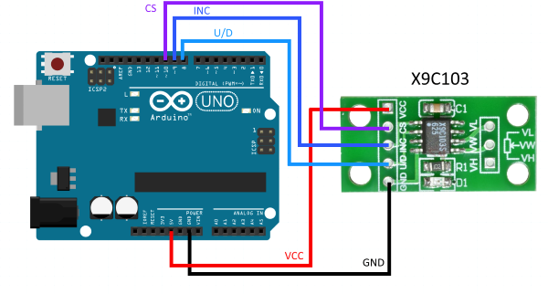 X9C103S — потенциометр с цифровым управлением, изменение сопротивления происходит благодаря массиву из 99 резисторов. Модуль может запоминать последнее значение сопротивления в EEPROM.